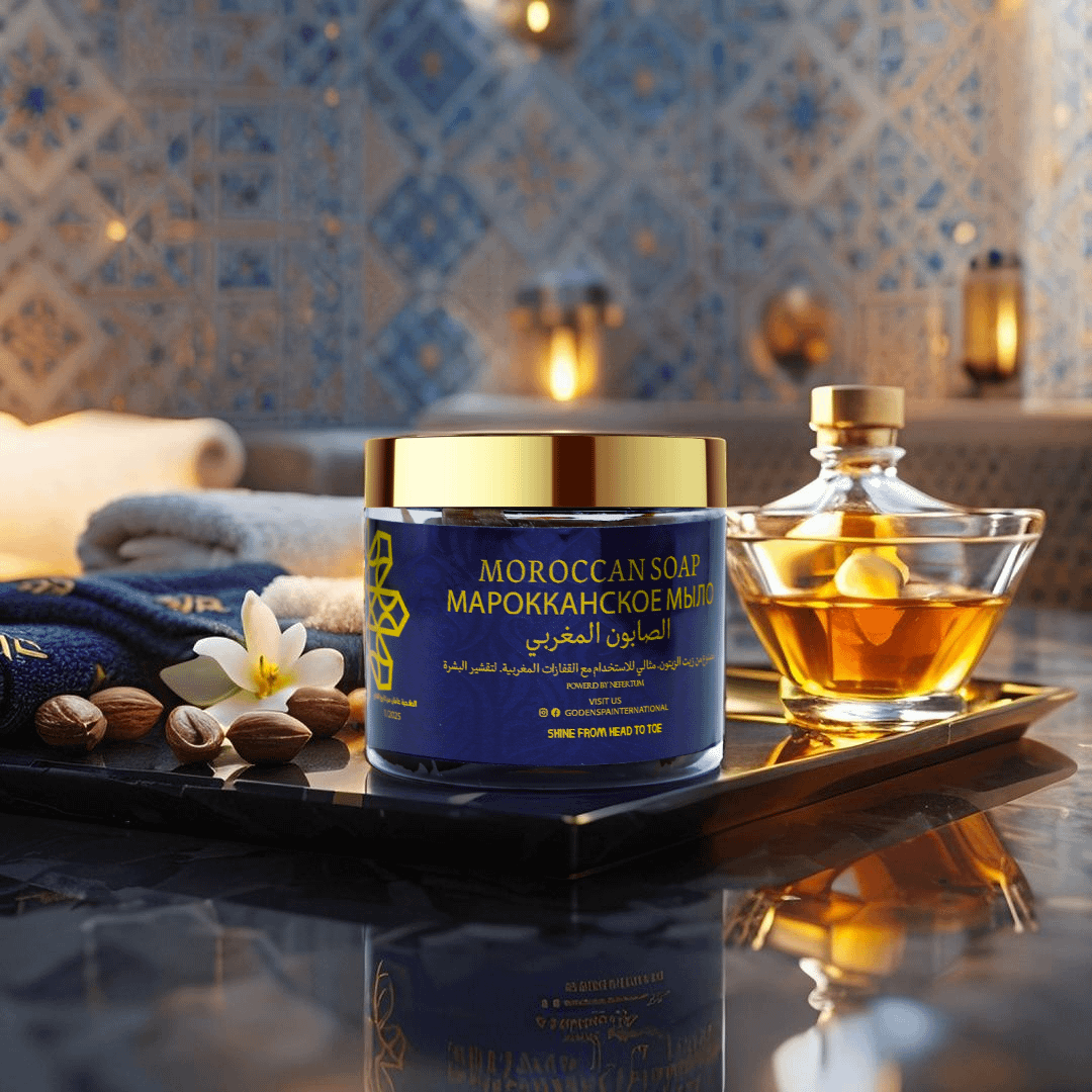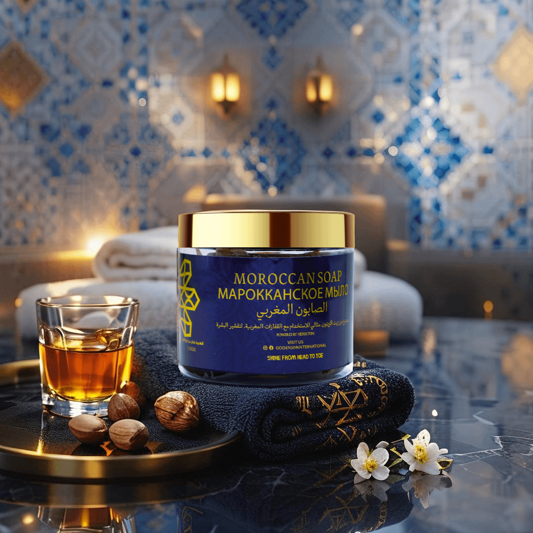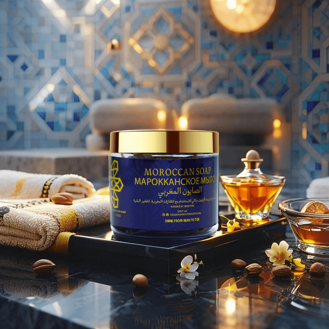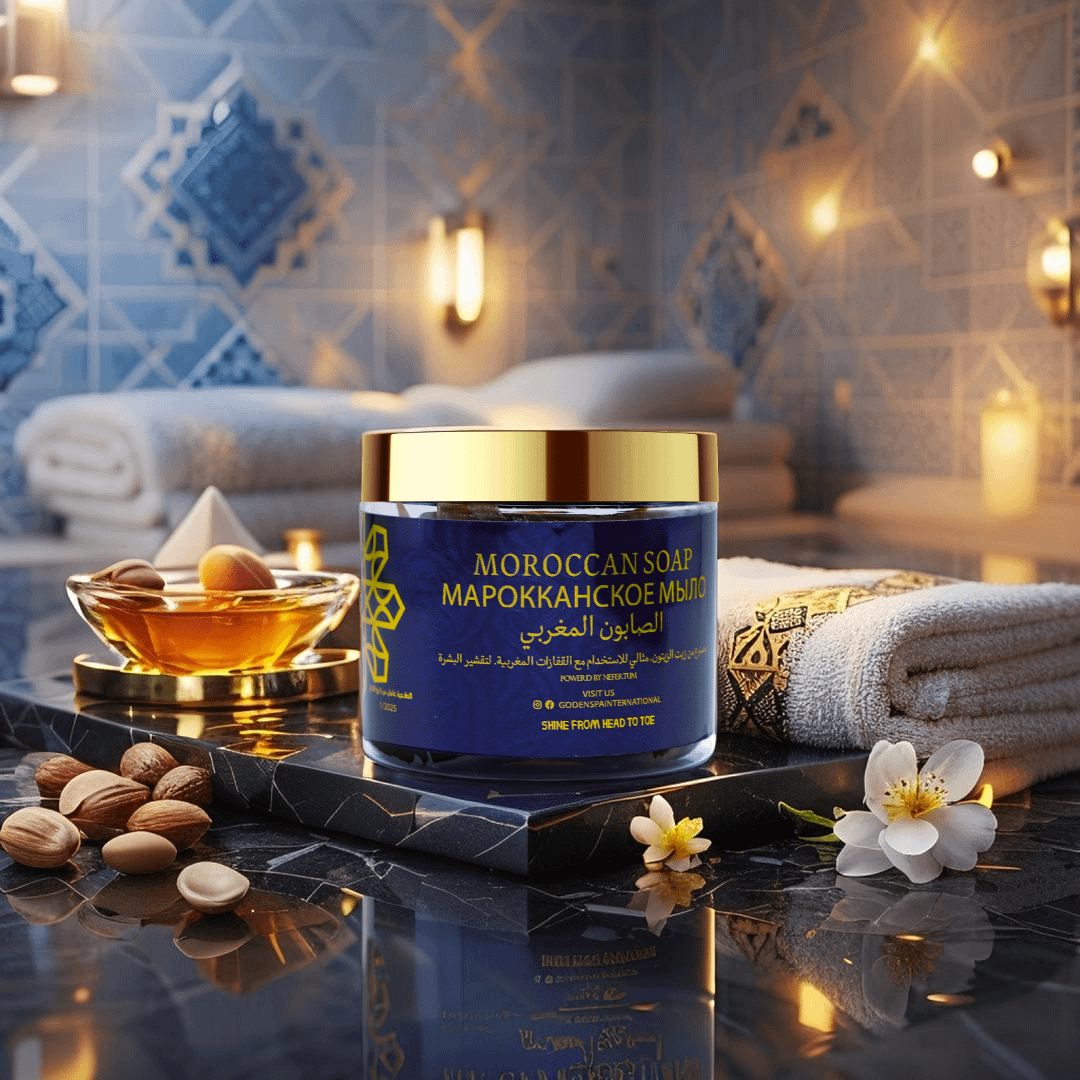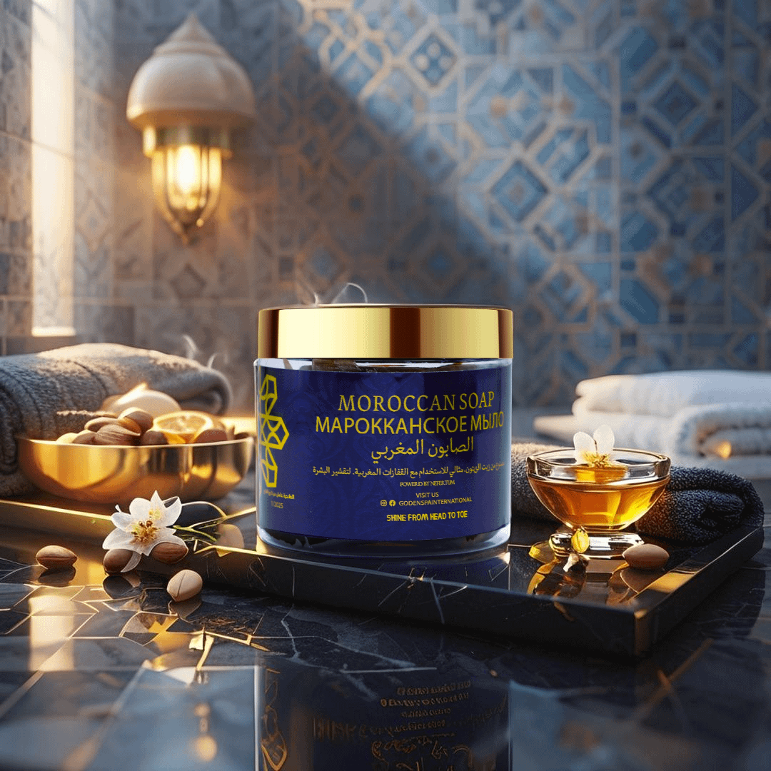 Transform your skincare ritual with the Golden Moroccan Cleansing Soap from Golden Body Care, a luxurious soap crafted to relax both body and mind. Inspired by traditional Moroccan hammam practices, this rich formula cleanses deeply while nourishing your skin with authentic ingredients like argan oil and eucalyptus. Its creamy texture and subtle citrus scent create a soothing spa experience, leaving your skin refreshed, soft, and radiant from head to toe. Designed to blend ancient Moroccan heritage with modern luxury, this soap elevates your daily routine into a moment of tranquility. Housed in an elegant blue jar with a gold lid, it reflects the premium quality and sophistication of the Golden Body Care line, making it a standout addition to your wellness collection.